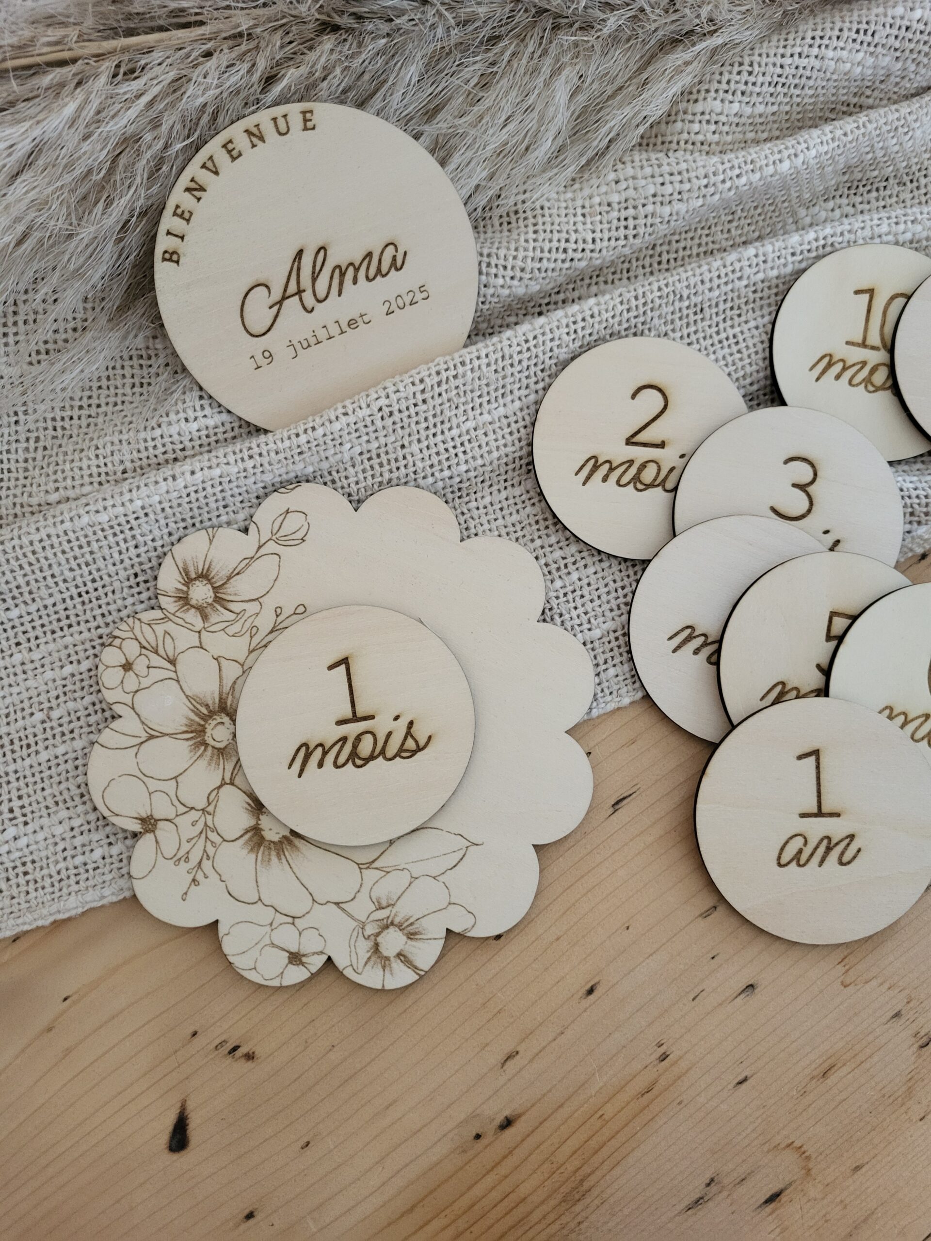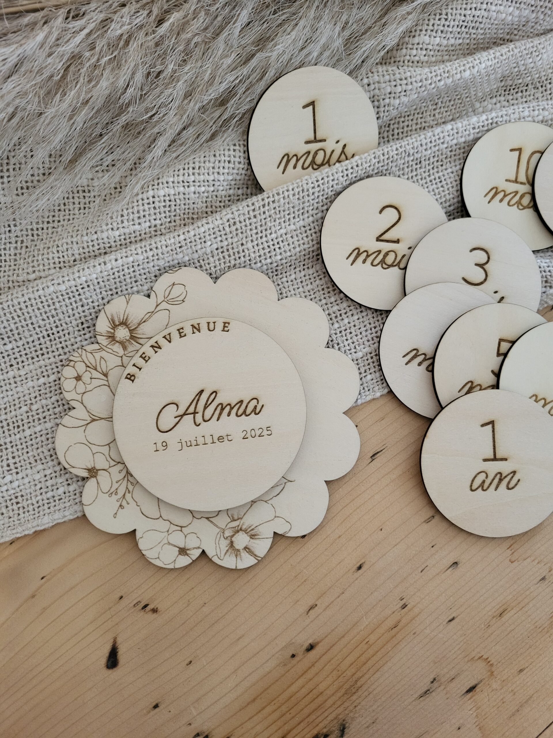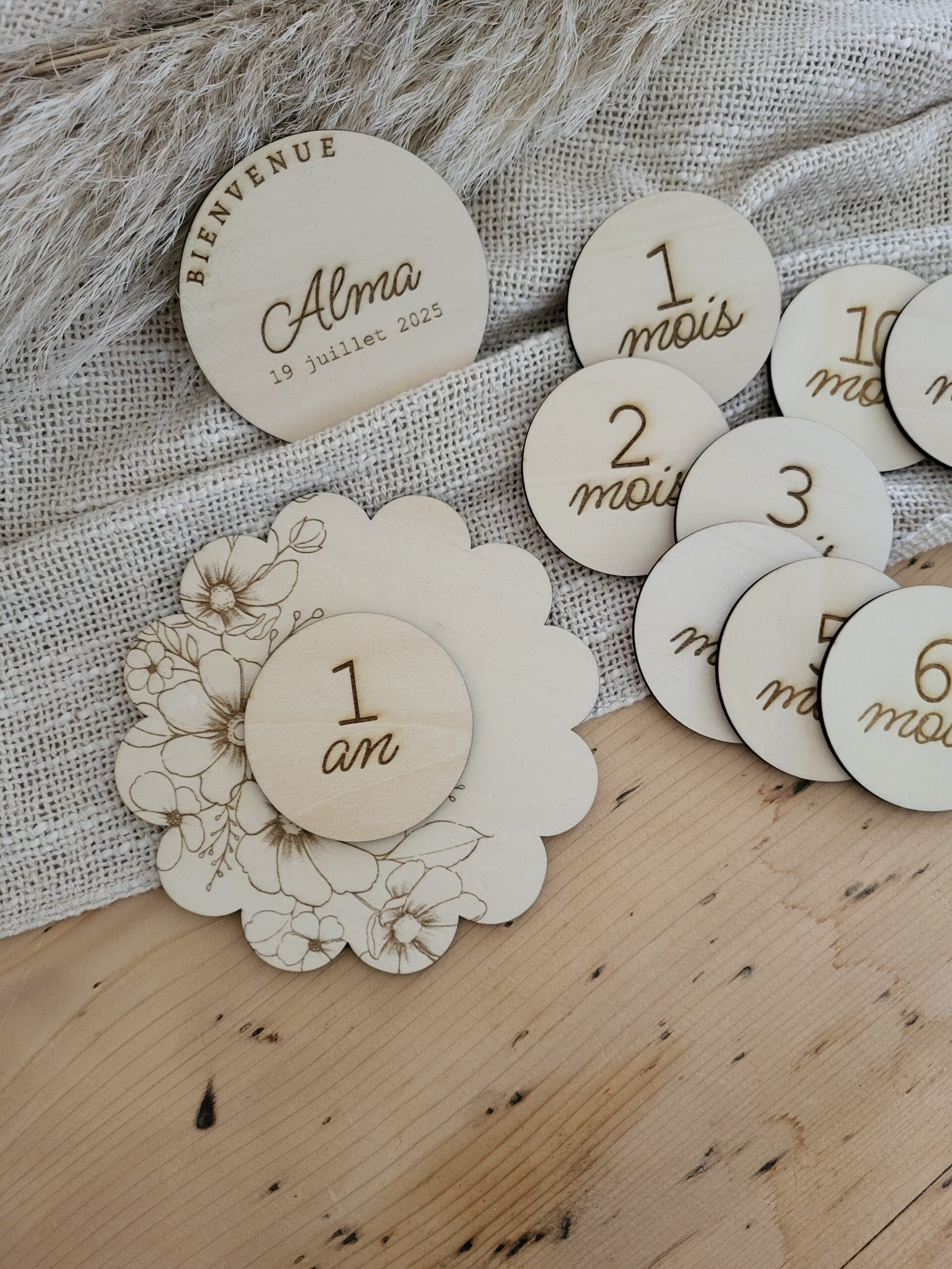 Ces jolies cartes étapes en bois accompagnent bébé mois après mois pour immortaliser ses progrès et créer de précieux souvenirs en photo. Personnalisées avec le prénom et la date de naissance, elles sont parfaites aussi bien comme cadeau de naissance que pour les futurs parents qui souhaitent préparer l’arrivée de leur enfant et garder une trace de cette première année. (Chaque rond du mois est aimanté au dos, ce qui permet de les changer facilement au fil du temps)