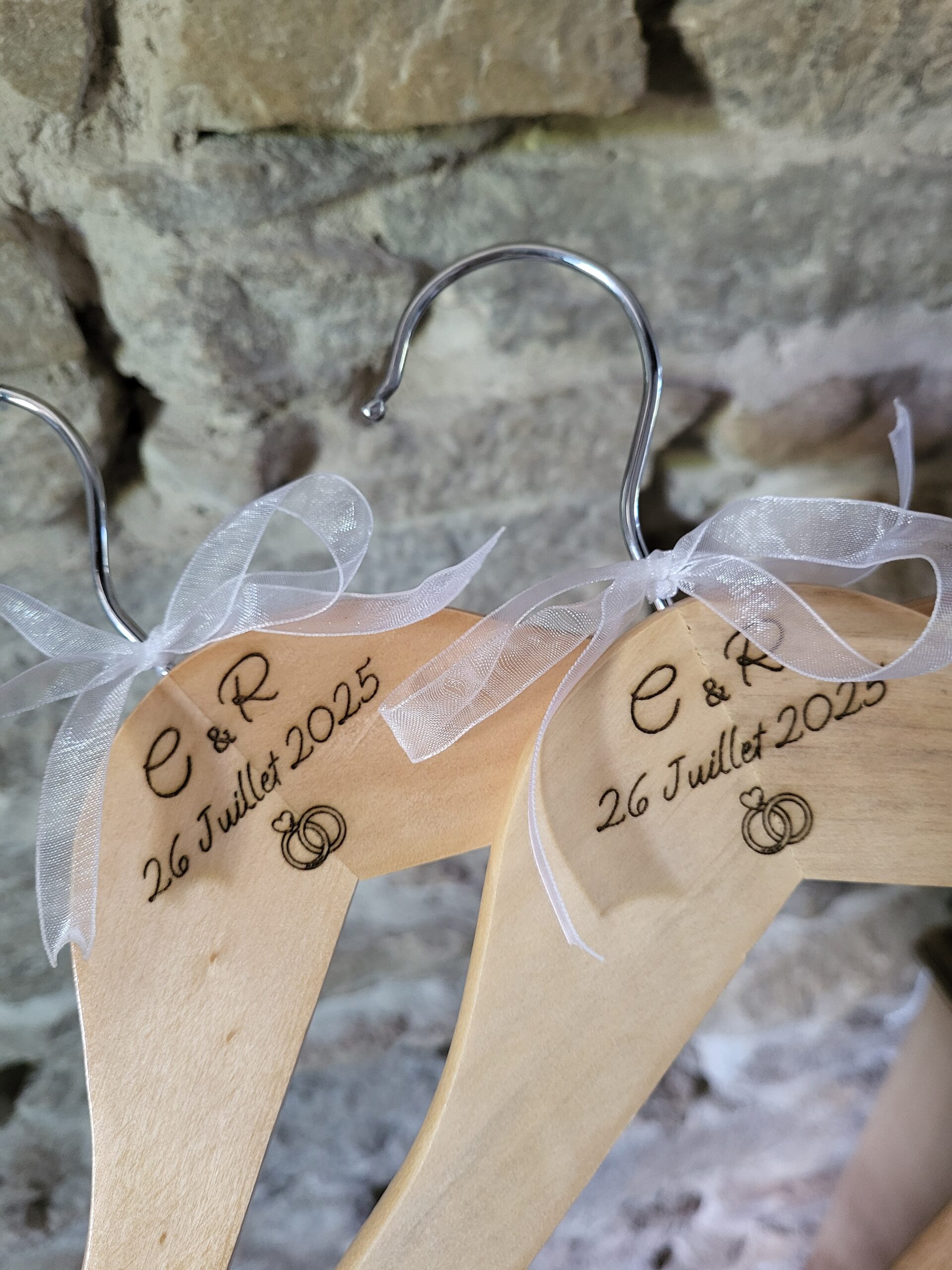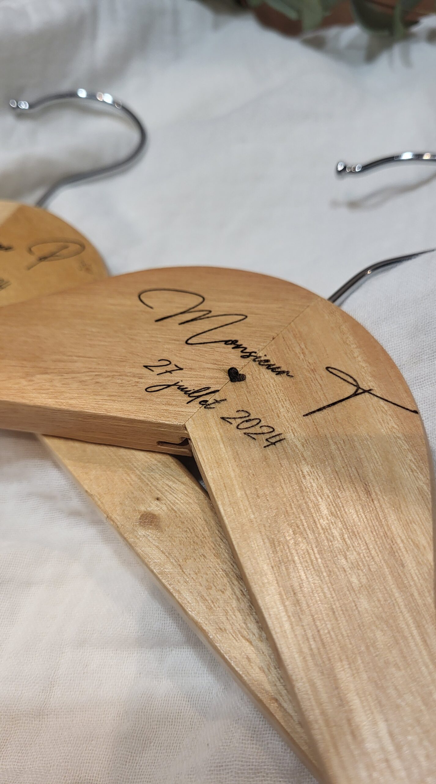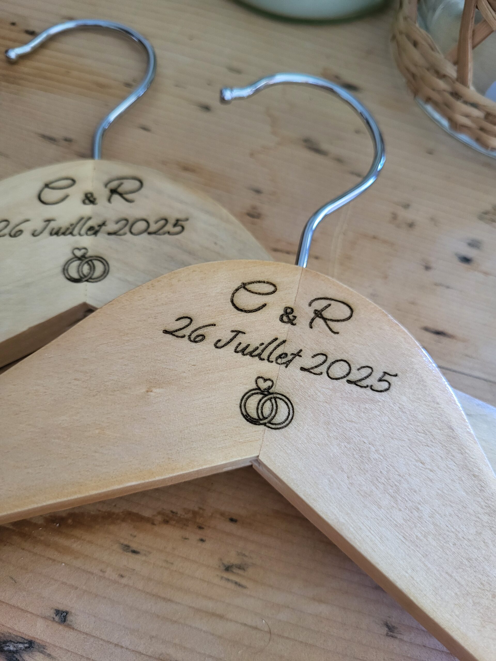 Lot de 2 cintres en bois pour adultes, spécialement conçus pour les mariés. Personnalisables avec les prénoms ou initiales, la date du mariage et un symbole de votre choix (cœur, fleurs, alliances…), ces cintres uniques sublimeront vos tenues le jour J et deviendront un précieux souvenir de cette journée inoubliable.