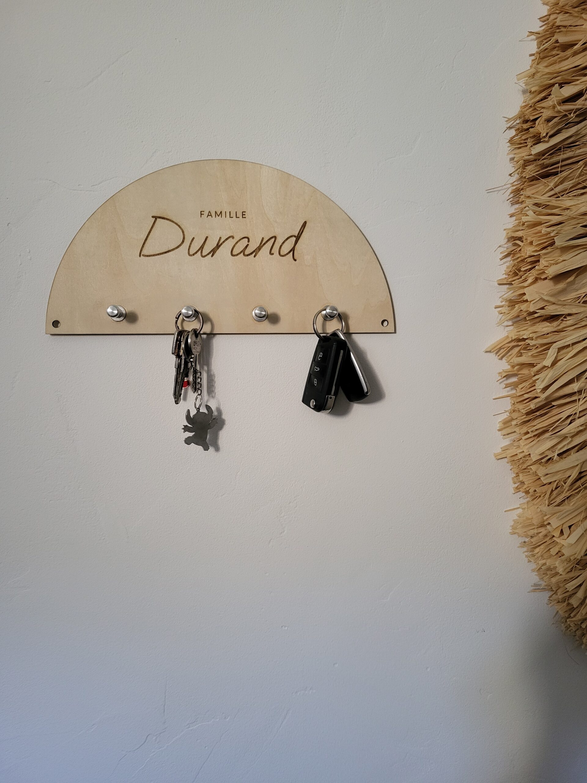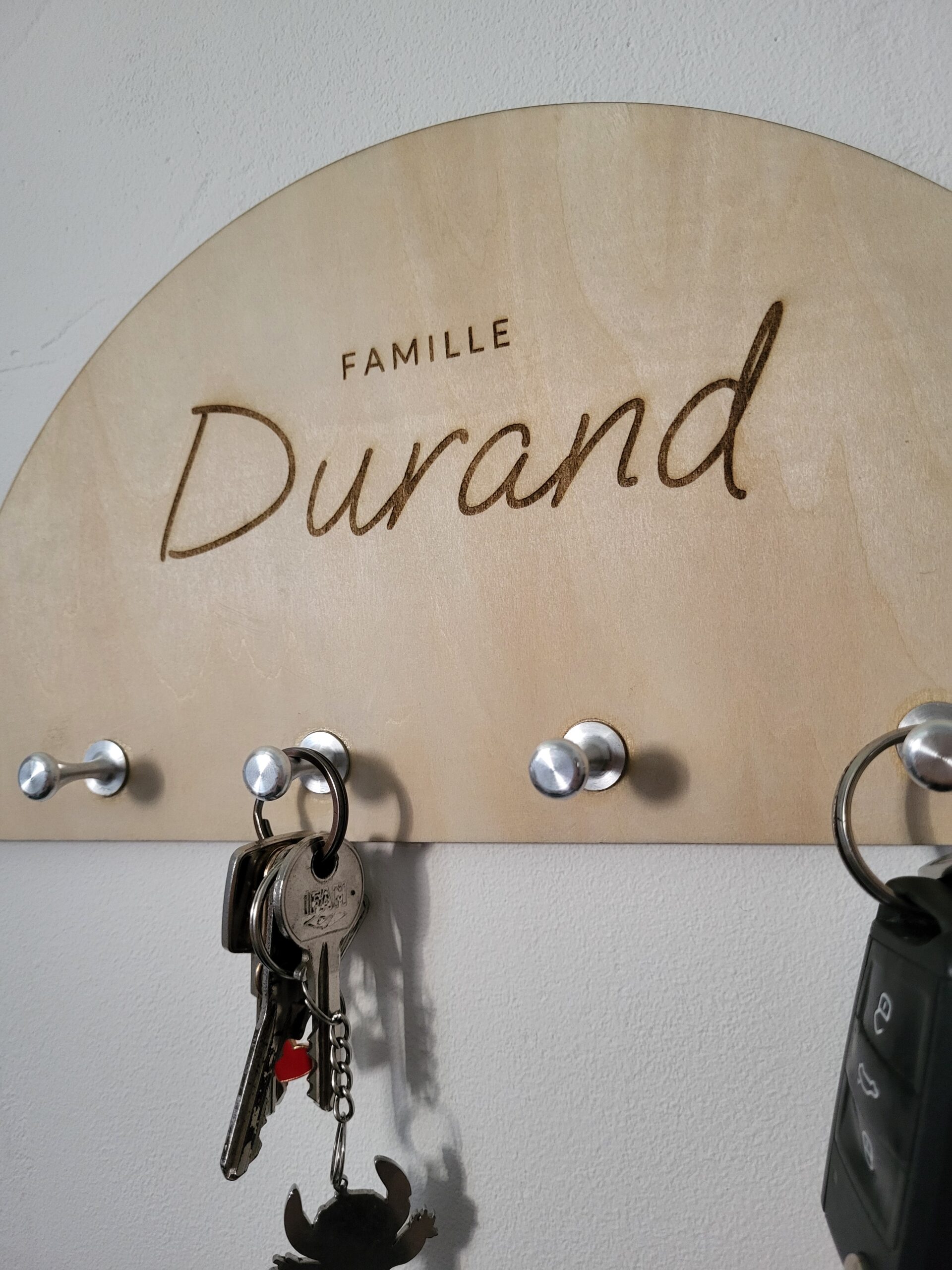 Support à clés mural en bois, à visser, équipé de 4 crochets pour organiser facilement vos clés au quotidien. Personnalisé avec le nom de famille, il apporte une touche chaleureuse et unique à votre entrée.